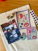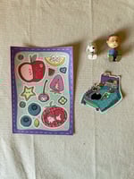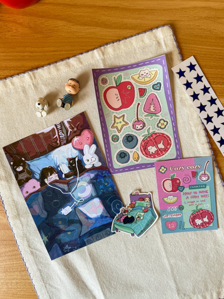 cozy quilt blankets, patch fruits stickers and a bed full of plushies